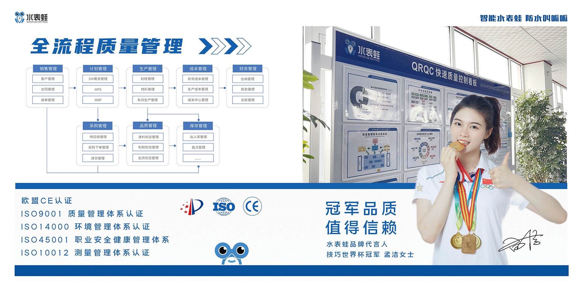 公司配备全自动水表校验、检验、焊接等数十台核心生产设备,可规模化生产DN15-DN300口径全系列水表,产品实力获得多重权威认证——先后通过质量管理体系、环境管理体系、职业健康管理体系、测量管理体系、售后服务体系及欧盟CE认证等,为产品品质筑牢根基。凭借过硬的技术与产品实力,公司物联网水表入选2025年《水利部水利先进成熟适用技术设备名录》优先推荐城镇节水技术设备,指导学生斩获2025年山东省黄炎培职业教育创新创业大赛二等奖、临沂赛区一等奖第一名,创新成果与行业影响力获得广泛认可。