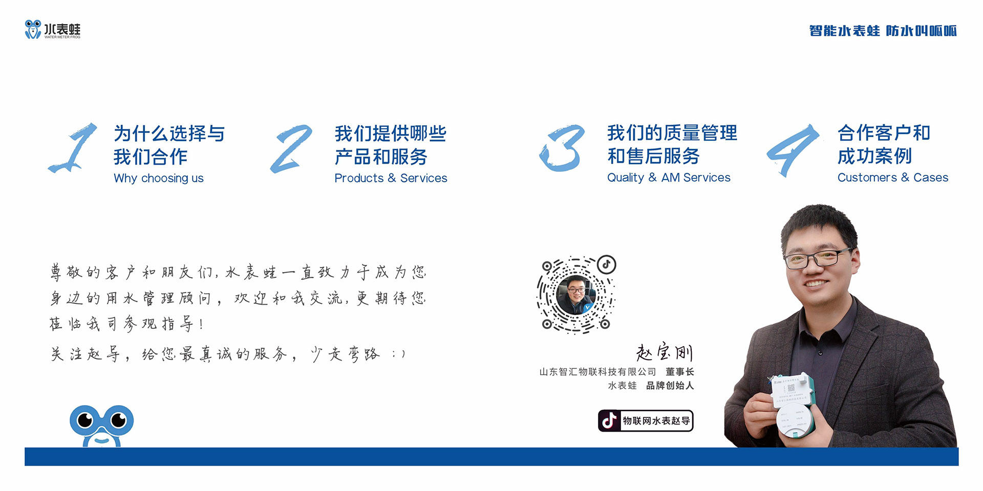 立足水表产业集群优势,公司定位高端,在深耕常规智能表计生产的同时,全力攻坚智能水表3.0技术革新。依托与上海、深圳、烟台等地高校及科研机构的深度合作,以李泉江教授为核心的研发团队,持续推出智慧水务平台、智慧农田灌溉、智慧物业等系列硬软件产品,为国家物联网新基建与“碳达峰、碳中和”战略落地贡献企业力量。